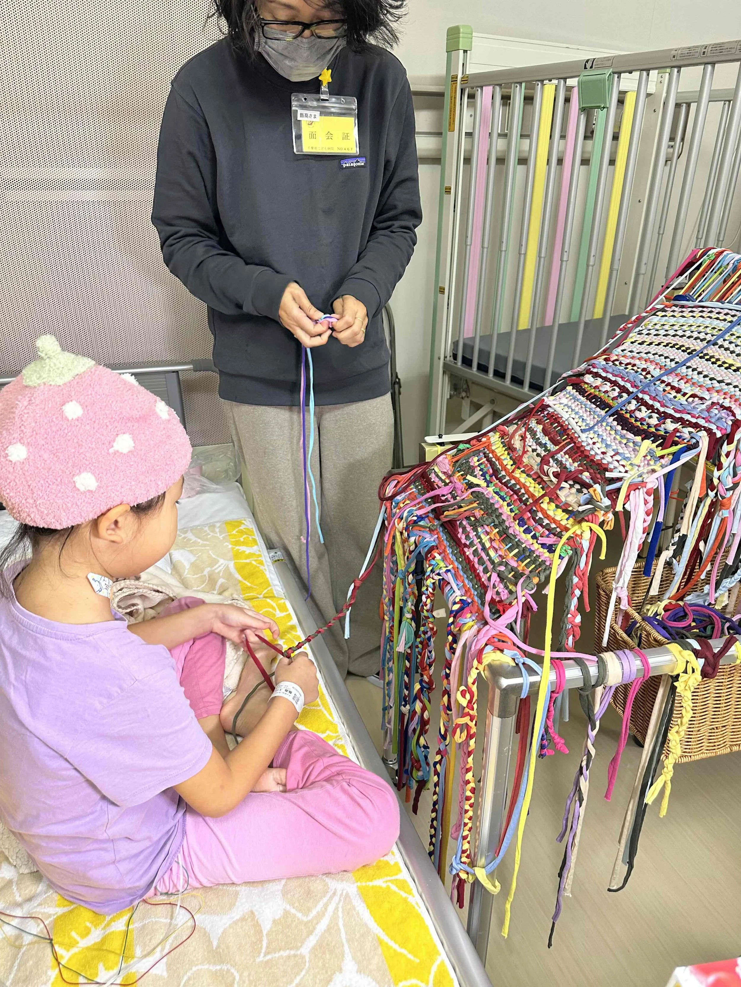 孤立した個(千葉県こども病院): 対照的に、病院では特定の対象に向けた特定な人へのみ届けるというアプローチを展開。移動式出前織り機「Ami Ami No.1 & No.2」を用い、病室から出ることのできない子どもたちのベッドサイドへ直接届けました。